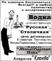 Таким образом, можно сделать вывод о том, что реклама должна способствовать созданию потребителям условий для свободного выбора торговых и других предприятий, услуг, товаров. Это позволяет контролировать продвижение товаров на рынке, создать и закреплять у покупателей систему предпочтений рекламируемых объектов, что необходимо в условиях насыщения рынка товарами и услугами. Советская реклама, не имея опыта работы в рыночной экономике, в перестроечный период широко заимствует опыт рекламы капиталистических стран, но зачастую далеко не лучшие его образцы.