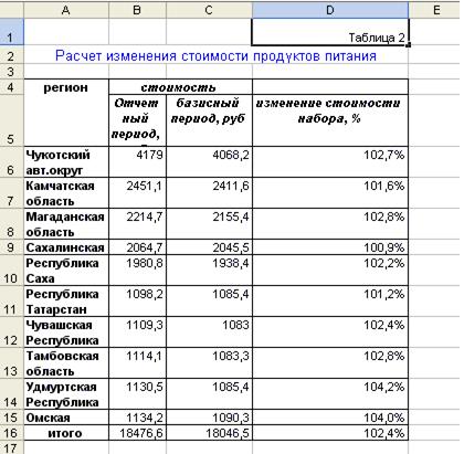 Расчетные формулы приведены в таблице 2 (экранная форма таблицы 2 приводится в приложении, рис.1)