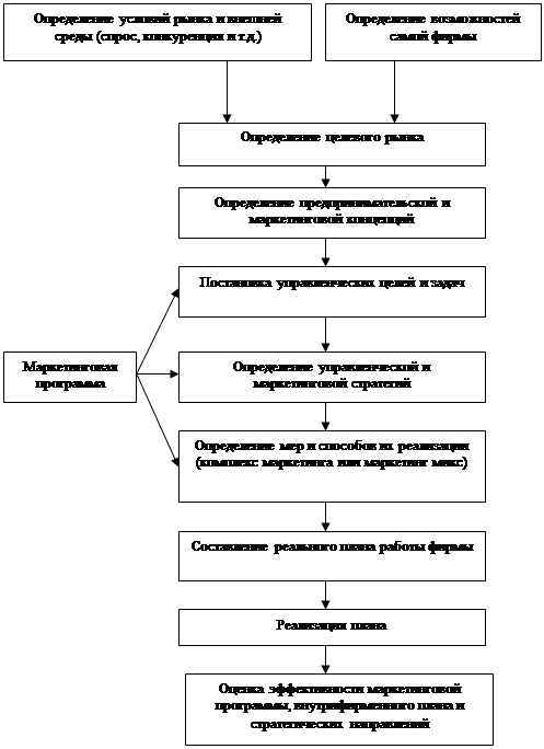 Маркетинговая программа составляется после завершения серьезного научно-практического исследования: анализа маркетинговой среды; комплексного изучения требований потребителей к товару; конъюнктуры рынка, его емкости и рыночного спроса; системы ценообразования, уровня и динамики цен, фирм-конкурентов, контрагентов и нейтралов; форм и методов сбыта; особенностей поведения покупателей и мотивов принятия ими решения о покупке, а также оценки производственно-ресурсных и сбытовых возможностей фирмы и определения уровня ее конкурентоспособности на различных рынках (или рыночных сегментах).