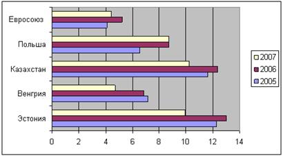 Диаграмма Рост ВВП на душу населения в Казахстане и странах Европы, 2005-2007гг. (в процентах)