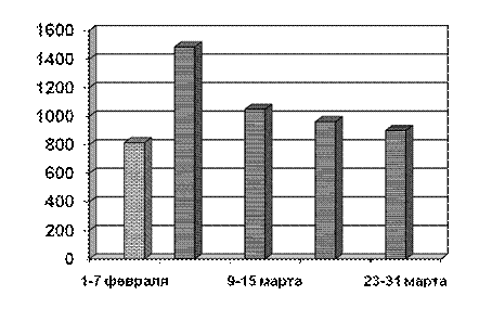 Как видно из данных таблицы 2 и рисунка 2, наибольшее увеличение товарооборота по сравнению с его февральским объемом было отмечено на протяжении первой недели марта, что связано с покупкой подарков к празднику 8-го марта теми, кого заинтересовало рекламное сообщение, затем товарооборот снижается, но все равно его объем за последнюю неделю марта остается большим, чем за неделю в феврале. Отсюда можно сделать вывод, что в противоположность к результатам мероприятий по стимулированию сбыта, эффект от которых имеется только в дни их проведения, рекламные акции оказывают обычно более длительное воздействие на покупателей, позволяя фирме–рекламодателю увеличить объем спроса во время рекламной акции и после нее. Поэтому рассматривать результаты этой рекламной акции следует не только за первую неделю после ее окончания, но за весь март. Делать это в более позднее время не имеет смысла, т.к. рост объемов продаж в апреле незначителен.