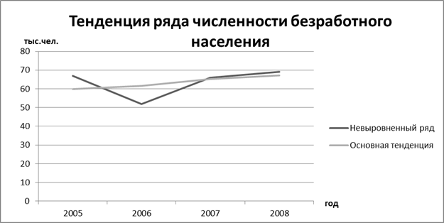 - основная тенденция ряда динамики – увеличение численности безработных за рассматриваемый период, что является показателем неблагоприятного развития рынка труда;