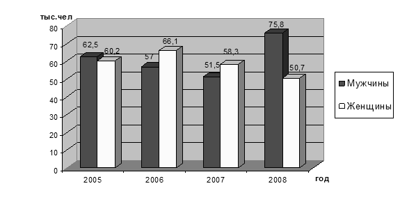 Как показывает диаграмма, в 2006 и 2007 годах число женщин среди безработных превышало число мужчин. Это объясняется более низкой востребованностью женского труда по сравнению с мужским. В 2008 году наблюдается резкое превышение количества мужчин среди безработных над количеством женщин (75,8 тыс. мужчин и 50,7 тыс. женщин). Причиной этого послужил начавшийся экономический кризис, повлекший за собой увольнение значительного числа работников.