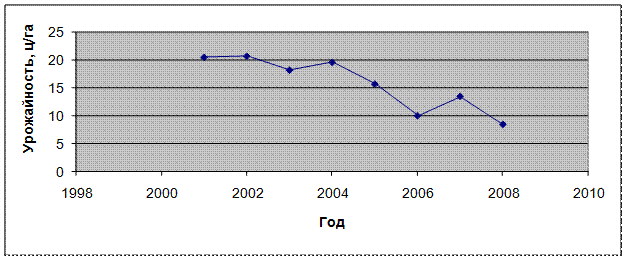 Анализируя график, можно сказать, что урожайность снижается, и в 2008 году составит 6,8ц /га.