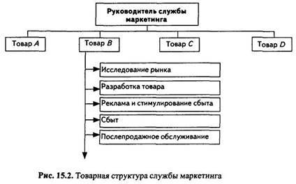 Предприятиям, выпускающим большое количество изделий, отличающихся значительным разнообразием в технологиях изготовления, а также и в потреблении, что требует специальных условий производства и сбыта, структуру службы маркетинга целесообразно строить по принципу товарной ориентации.