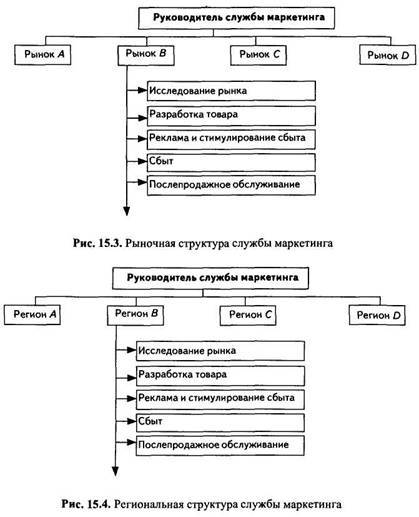 В этом случае вводятся должности управляющих по рынкам (по аналогии с товарной структурой), что позволяет основное внимание сосредоточить на нуждах, потребностях и запросах покупателей конкретных рынков или их сегментов. По каждому рынку разрабатывается соответствующая его специфике стратегия маркетинга, ориентированная на как можно более полный учет потребительных свойств товара, форм его продвижения, осознанных и неосознанных ожиданий покупателей. Все это делает структуры, ориентированные на рынки, более эффективными.