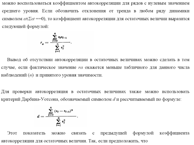 1) в рядах динамики зачастую наблюдается зависимость между последующими и предшествующими уровнями. Наличие такой связи в статистической литературе называют автокорреляцией. При изучении взаимосвязи между рядами динамики с применением методов корреляционно-регрессионного анализа автокорреляция должна быть исключена из каждого из сравниваемых рядов динамики;