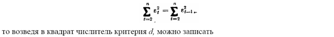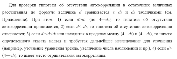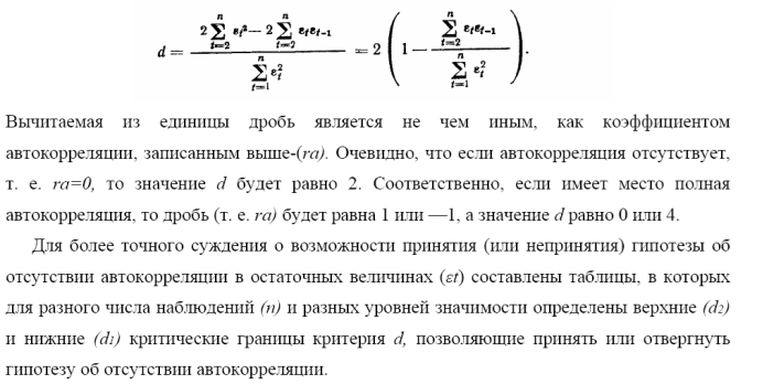 Значение d близко к величине 2*(1 - r 1 ), где r - выборочный коэффициент автокорреляции для остатков. Соответственно, идеальное значение статистики - 2 (автокорреляция отсутствует). Меньшие значения соответствуют положительной автокорреляции остатков, большие - отрицательной.