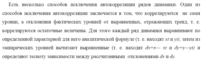 Имеется несколько способов исключения автокорреляции. Первый способ состоит в исключении от фактических уровней тренда (т.е. «выравненного» ряда). По каждому показателю времени находится отклонение фактического уровня от расчетного (сглаженного, выравненного). Т.е. коррелируют отклонения. Как показатель тесноты связи между изучаемыми рядами динамики используется коэффициент корреляции отклонений.