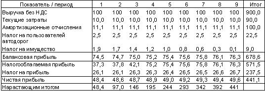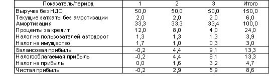 Если реализация проекта предполагает использование собственных средств (1 млн. USD в нашем примере), то проект позволяет получить общую прибыль (после налогообложения) 1,5_млн.USD за 4 года (0,5_млн.USD после возврата собственных средств). Возврат вложенных собственных средств - 2 года.