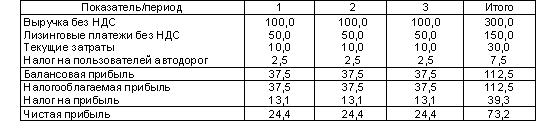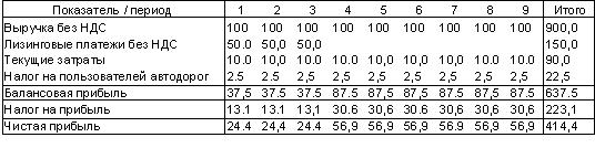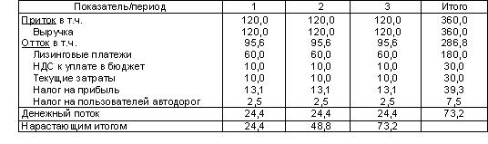 В целом лизинговая сделка оказалась выгоднее, чем инвестиционный кредит. Суммарный денежный поток лизинговой сделки превысил денежный поток заемщика на 6,1 единиц или на 1,5%.