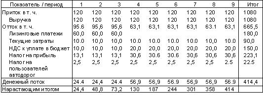 Накопленная сумма денежных средств лизинговой компании составила 8,5, лизингополучателя - 414,4 . Суммарный денежный поток лизинговой компании и лизингополучателя составил 423,1. Этот денежный поток можно рассматривать как совокупный денежный поток лизинговой сделки в целом.