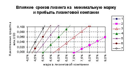 Расчеты показали (из-за экономии места не приведены), что процентная прибыль лизинговой компании (1,1 млн.USD в случае, когда все средства заемные) в основном используется на покрытие налогов с выручки, имущество и прибыль (0,7 млн.USD). Очевидно, что процентная прибыль "сильнее" зависит от сроков лизинга чем налогооблагаемая база (лизинговые платежи). Поэтому минимально необходимая маржа лизинговой компании зависит от сроков лизинга.