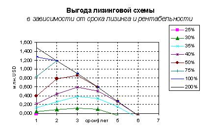 Не смотря на то, что лизинговые проценты (23%) существенно выше ставки по кредиту (12%), лизинговая схема дает выгоду 0,5 млн.USD (суммарную для лизинговой компании и лизингополучателя). Основная причина - уменьшение налога на прибыль за счет отнесения лизинговых платежей на себестоимость. При лизинге, оборудование успевает как бы полностью амортизироваться. При варианте прямого кредитования это не всегда возможно. Что касается лизингодателя, то у него заложена возможность ускоренной амортизации (коэффициент до 3).