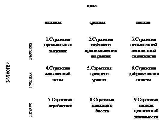Фирма должна изучить размеры и темпы рынка, а также каждого конкурента, в рамках из девяти вариантов рассматриваемых качественным ценовым позиционированием (рис.5). Наше предприятие: стратегия глубокого проникновения на рынок, конкурент – стратегия доброкачественности.