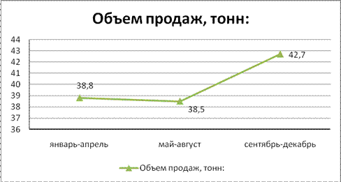 За исследуемый год произведено и реализовано укрупненных штучных конфет «Леди-день» в объеме 120 тонн. Из них: в январе-апреле 38,8 тонн; в мае-августе 38,5 тонн; в сентябре-декабре 42, 7 тонн. Данные представлены на графике: