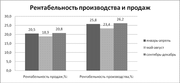 2).В сочетании с незначительным падением объема продаж во второй трети возросшие затраты отразились в показателе рентабельности производства