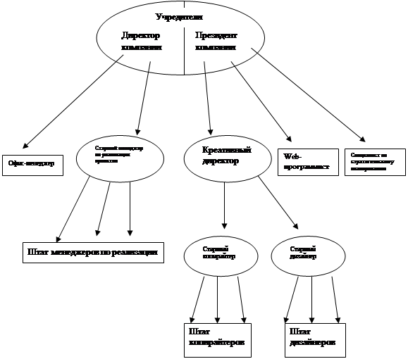 Органом управления общества директор и президент компании. Структура компании построена следующим образом: основная часть персонала разделена на копирайтеров, дизайнеров и менеджеров по реализации, над каждой группой есть старший, т.е., к примеру, старший дизайнер. Над разработчиками стоит креативный директор, над менеджерами – директор компании. Структуру агентства можно представить в виде схемы (см. рис. 2).