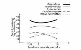 Графически структура грузооборота торговых оптовых баз различной площади изображена на рис. 73. Анализ этой структуры показывает, что наиболее высокую значимость логистический подход имеет при организации потоков продовольственных товаров.