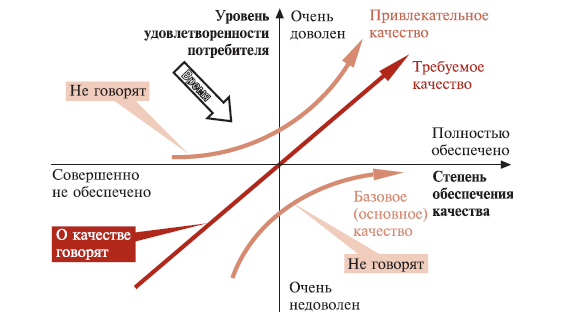 Модель Кано отражает восприятие качества потребителем и способствует его пониманию, так как показывает взаимосвязь между качеством продукции и параметрами этого качества. Кано в своей теории привлекательного качества выделяет три составляющие профиля качества: