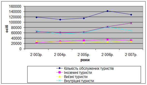 Отже, з наведених даних табл. 1. та рис.1. видно, що обсяги турпотоків за досліджуваний період часу зростають за всіма видами туристів. Проте в 2007 р. спостерігається значне скорочення турпотоків, порівняно з 2006 р. Дана тенденція викликана значним скороченням кількості внутрішніх та іноземних туристів.
