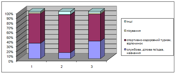 Для вибору перспективного сегмента важливим є розгляд розподілу туристів не тільки за категоріями, але й за метою відвідування. Розподіл туристів за метою відвідування у 2007 році наведено у табл.2 та рис. 2.