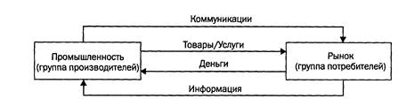 Продавцы и покупатели вовлечены в четыре потока. Продавцы отправляют товары, услуги и средства коммуникации (реклама, почтовая рассылка и т.п.) на рынок;