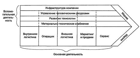 На рис. 3 показана общая схема создания стоимости — девять процессов, из которых пять основных (внутренняя логистика, текущие операции, внешняя логистика, присвоение марки и продажа, сервис) и четыре вспомогательных (материально-техническое снабжение, развитие технологии, управление человеческими ресурсами и инфраструктура.