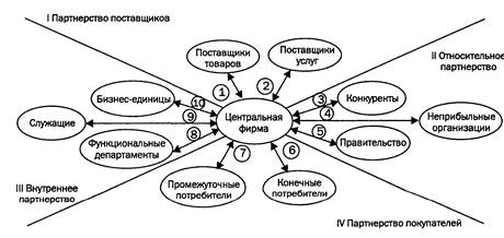 Есть другой аспект маркетинга отношений, изученный Морганом и Хантом. Их модель характеризует новые функции, взаимосвязи компаний с окружающей средой. На рис. 4 показаны 10 дискретных форм и типов маркетинга отношений. Среди них прежде всего надо выделить партнерство с поставщиками (товаров и услуг), хотя нельзя избежать сопутствующих полезных контактов (например, с некоммерческими и правительственными организациями). Третье направление представлено потребителями, но автор хотел бы подчеркнуть, что покупатель как самая важная цель бизнеса должен находиться в конце цепочки, после внутренних партнерских связей, которые должны регулироваться бизнес процессом.