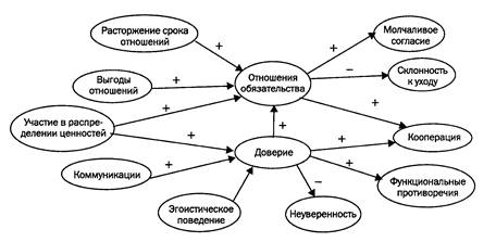 Теория основных опосредованных переменных рассматривает часть отношений доверия и обязательств (рис. 5). Предполагается, что эти отношения лежат в основе контрактов и определяются опосредованным преимуществом пяти важных изначальных элементов (например, конечными издержками, привилегиями, распределением цен, коммуникациями и эгоистичным поведением) и пяти на выходе продукции (неофициальным соглашением, склонностью к уходу из бизнеса, сотрудничеством, функциональной противоречивостью обязанностей и сомнением в правильности принятия решений).