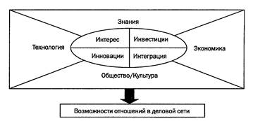 На рис. 6 факторы модели "41" могут рассматриваться как зависимые переменные внутренних свойств других элементов (в основном агентов окружающей среды) аналогично независимым переменным. Можно рассматривать всю сеть как комплексную и мультипликаторную форму развития самой удобной кооперации для данной компании в новой экономике. Возможности сетевых отношений выполняют функции целевого рынка, в котором его субъекты достигают своих главных целей.