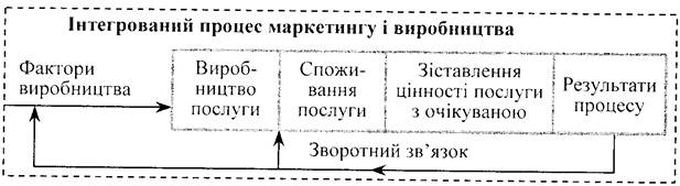 Процес виробництва і продажу послуг за характером істотно відрізняється від процесу виробництва і продажу товарного продукту, а відповідно і маркетингові та виробничі засоби щодо приведення результату процесу до задоволення потреб споживача також є відмінними від засобів товарного маркетингу. Характерні особливості послуг: невідчутність, швидкоплинність (неможливість зберігання), невіддільність від джерела виробництва та непостійність якості передбачає контакт з покупцем, участь покупця у процесі виробництва послуги та високу особисту оцінку виробника послуги і, відповідно, процес виробництва послуг є таким, у якому задіяні усі функції, пов'язані як з факторами виробництва, так і з маркетингом (рис.4), що потребують кооперування і координації для створення цінності та задоволення покупця.