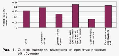 2. При принятии решения об обучении решающими факторами оказались «получаемые знания» и «квалифицированные преподаватели». «Стоимость обучения» занимает лишь четвертое место по значимости (рис. 1, 2).