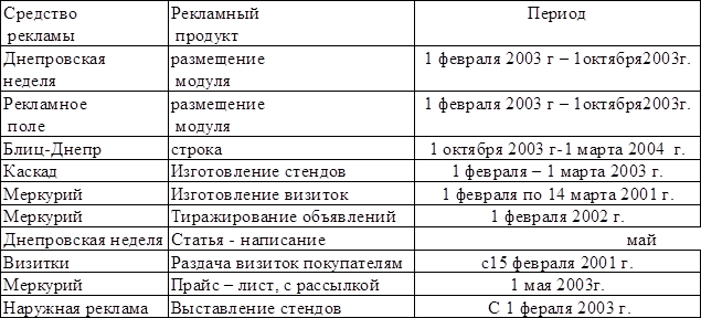 По решению руководства на 2003г. финансирование средств рекламы увеличено до 60000 грн. в год.
