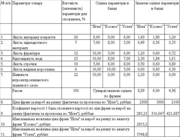Аналіз даних розрахунків, наведених в табл.1.2, показує, що з використан-ням коефіцієнту вартості 1 бала споживчої вартості виробу[1] по аналогу фірми «Космос», максимальна прогнозна ціна нового виробу фірми «Игла» може стано-вити 2815 руб. Таким чином, попередня ціна виходу на ринок фірми «Игла» з но-вим виробом по ціні 2500 руб. буде конкурентоспроможною і новий вироб пови-нен мати споживчий попит навіть при підвищенні ціни до 2800 руб за рахунок наявності нового вітронепроникаючого тканевого слою.