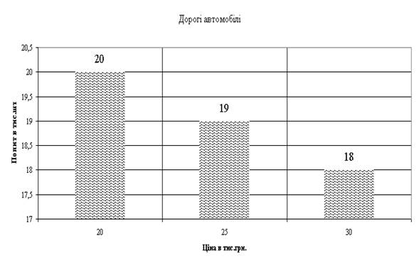 - в сегменті “дорогих” автомобілей покупців демонструють нееластичний попит, при чому чутливість попиту по ціні є негативною, але дуже низькою за модулем, тобто підвищення ціни на автомобілі в цьому сегменті впливає слабо, тобто є готовність придбати більш дорогу модель, якщо на неї буде поточна бізнес-мода;