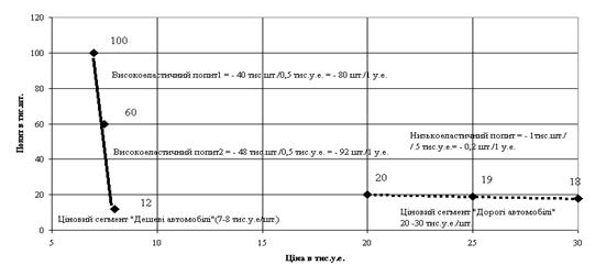 1. На рис.4.3 наведені результати сегментації ринка та розрахунків коефіцієнтів цінової еластичності в сегментах “дешеві автомобілі” та “дорогі автомобілі” виконані методом об’єднання графіків рис.4.1 та 4.2 в одному масштабі на одному рисунку.