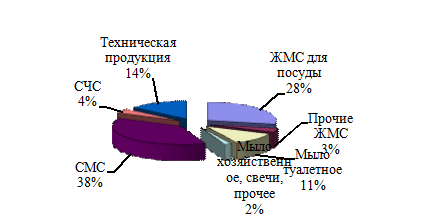 Производство порошкообразных синтетических моющих средств (СМС) и жидких моющих средств (ЖМС) для посуды в настоящее время является приоритетным для ОАО «Нэфис Косметикс». На долю этих товарных групп по итогам 2008 года приходится 38% и 28% от общего объема реализованной продукции соответственно (в денежном выражении) рис. 4.1.