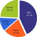 − по продажам синтетических моющих средств – 7,1%. Это первое место среди российских производителей и третье место после мультинациональных компаний «Procter&Gamble», «Henkel»;