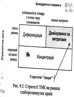 Використовуючи матрицю базових стратегій М. Портера, зобразимо з огляду обрання ТНКр відповідну конкурентну стратегію (рис. 9.6).