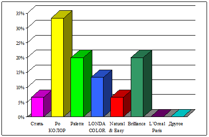 На графике видно, что большим спросом пользуется краска для волос Ро КОЛОР, ее выбрали 33% опрошенных. Средним спросом пользуется марка краски Palette и Brillianceею пользуются 20% отвечавших.13% выбрали краску для волос производителя LONDA COLOR. Brilliance и Стиль выбрали всего 7% опрошенных. А L’OrealParis из опрошенных никто отметил.