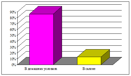 Из графика видно, что 87% опрошенных окрашивают волосы в домашних условиях, а 13% предпочитают окрашивать волосы в салоне. Большая часть женщин окрашивают волосы в домашних условиях, потому что у них нет времени, чтобы сходить в салон, либо не позволяет уровень дохода.