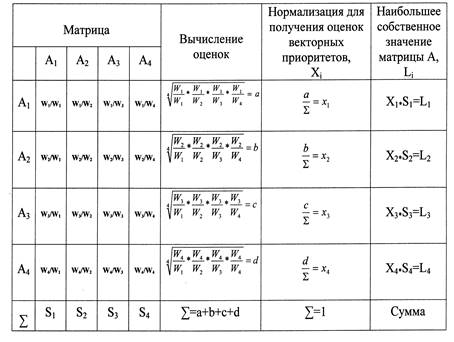 | Матрица | Вычисление оценок | Нормализация для получения оценок векторных приоритетов, Хi | Наибольшее собственное значение матрицы А, Li | ||||