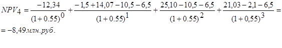 Также для сравнения предположим, что ставка дисконтирования увеличилась до 55%. Проведем расчет показателей: