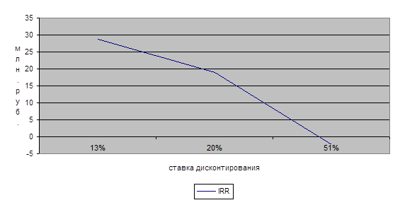 Чистый приведенный доход в последнем исследуемом нами году составит -2,23 млн. руб. Полученные расчеты показали, что при увеличении ставки дисконтирования до 20% проект остается экономически выгодным и его чистый приведенный доход к 2017 году составит 19,03 млн. руб. Если же мы увеличим коэффициент дисконтирования до 55%, то проект станет экономически невыгоден, его чистый приведенный доход даже к 2017 году останется отрицательным и составит – 2,23 млн. руб.