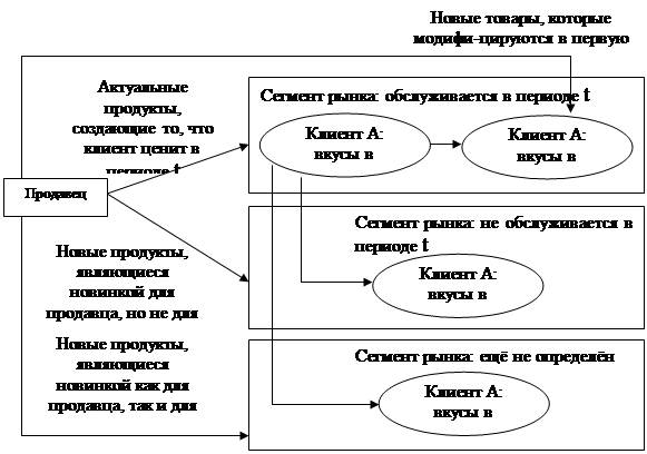 Предприятия могут обеспечивать лояльность клиентов, создавая новые продукты и предлагая их ключевым потребителям до тех пор, пока они не изменят свои ожидания (то есть в периоде от t к t+1). Изменения вкусов клиентов приводят чаще всего до трех различных рыночных ситуаций. Во-первых, клиенты могут оставаться внутри нынешнего сегменту рынка, даже если их вкусы изменяются. В этом случае продавцы вынуждены обращаться к модификации существующих продуктов.