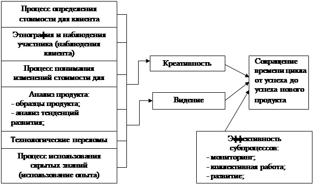 На рисунке1.2. представлен процесс, спроектированный для генерации целостной информации о клиенте с целью сокращения этапов создания нового продукта. В нем учтенная схема исследования будущих ожиданий клиентов, этнографические процессы и процессы понимания изменений ценности для клиентов, обогащенные анализами продуктов, исследование технологических переломов, креативности и видение развития [1].
