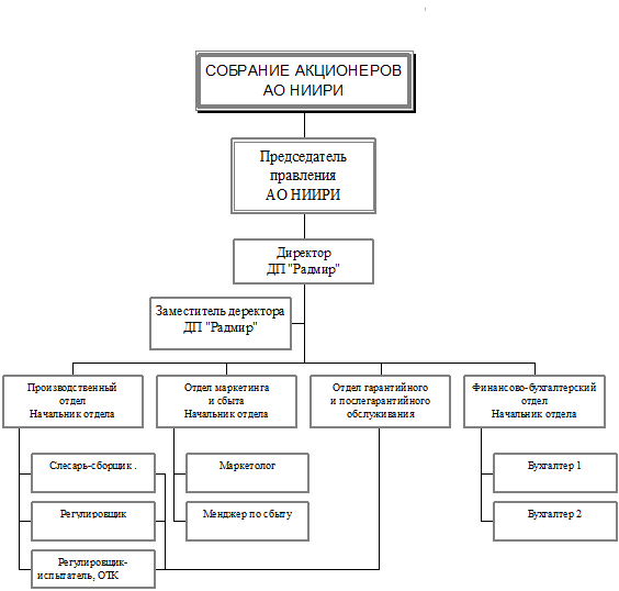 Реализация инновационного проекта производства КРМЦ «Мадис» идёт в рамках организационной структуры фирмы «Радмир» (см. Приложение А), осуществляющей проведение научно-исследовательской работы, изготовление, маркетинг, сбыт и техническое обслуживание медицинской аппаратуры.