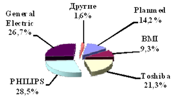 Три последние из названных фирм являются наиболее мощными мировыми производителями промышленной, бытовой, организационной и медицинской техники. Доля мирового рынка этих крупнейших в мире производителей значительна (см. рис.2.2), хотя на украинском рынке их присутствие невелико и ограничивается, в основном, частными клиниками – из-за чрезвычайно высокой стоимости продукции при исключительно ценовой конкуренции. Это также частично касается и фирм Planmed и BMI.