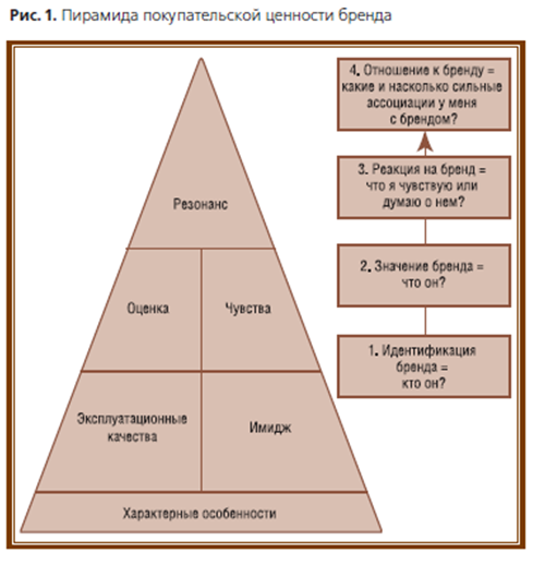Перечисленные этапы представляют собой фундаментальные вопросы, которые так или иначе задают покупатели относительно бренда: 1) кто он (идентификация бренда); 2) что он (значение бренда); 3) что я чувствую или думаю о нем (ре_ акция на бренд); 4) какие ассоциации и насколько сильные связи у меня с брендом (отношение к бренду).